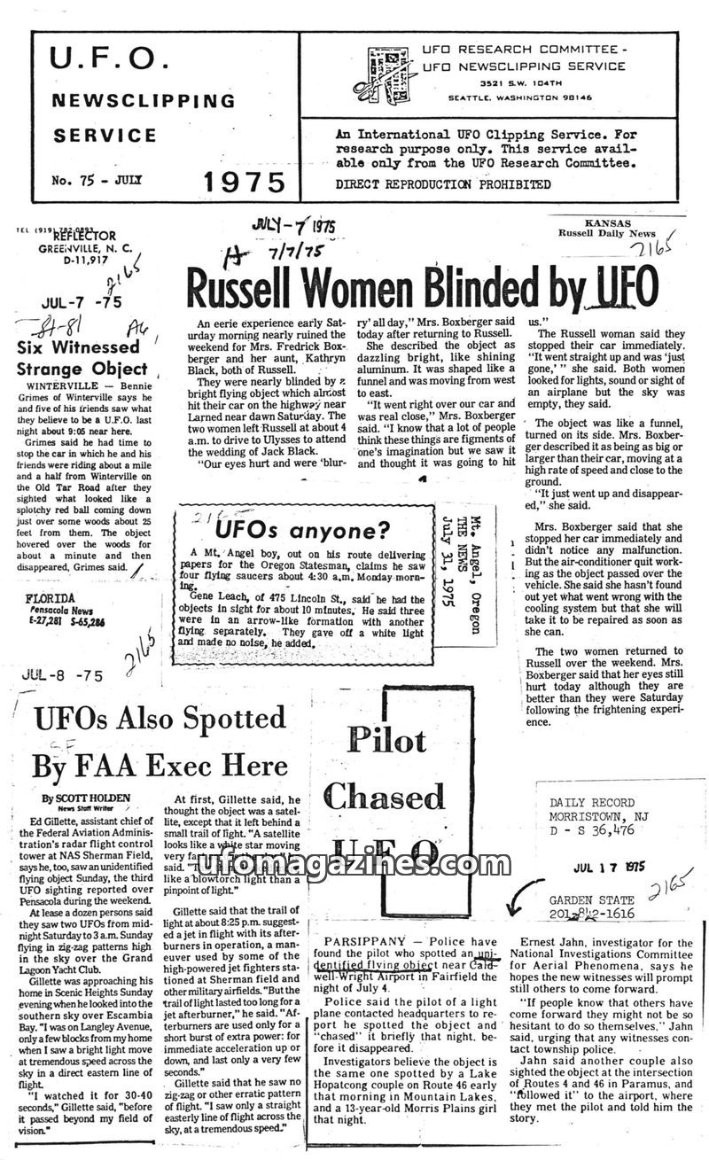 This issue of UFO Newsclipping Service from July 1975 compiles numerous UFO sighting reports from across the United States. Key incidents include a blinding encounter in Kansas, a
