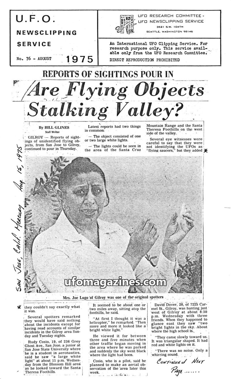 This issue of the UFO Newsclipping Service from August 1975 details numerous sightings of unidentified flying objects across the United States. Reports from Gilroy, California, des