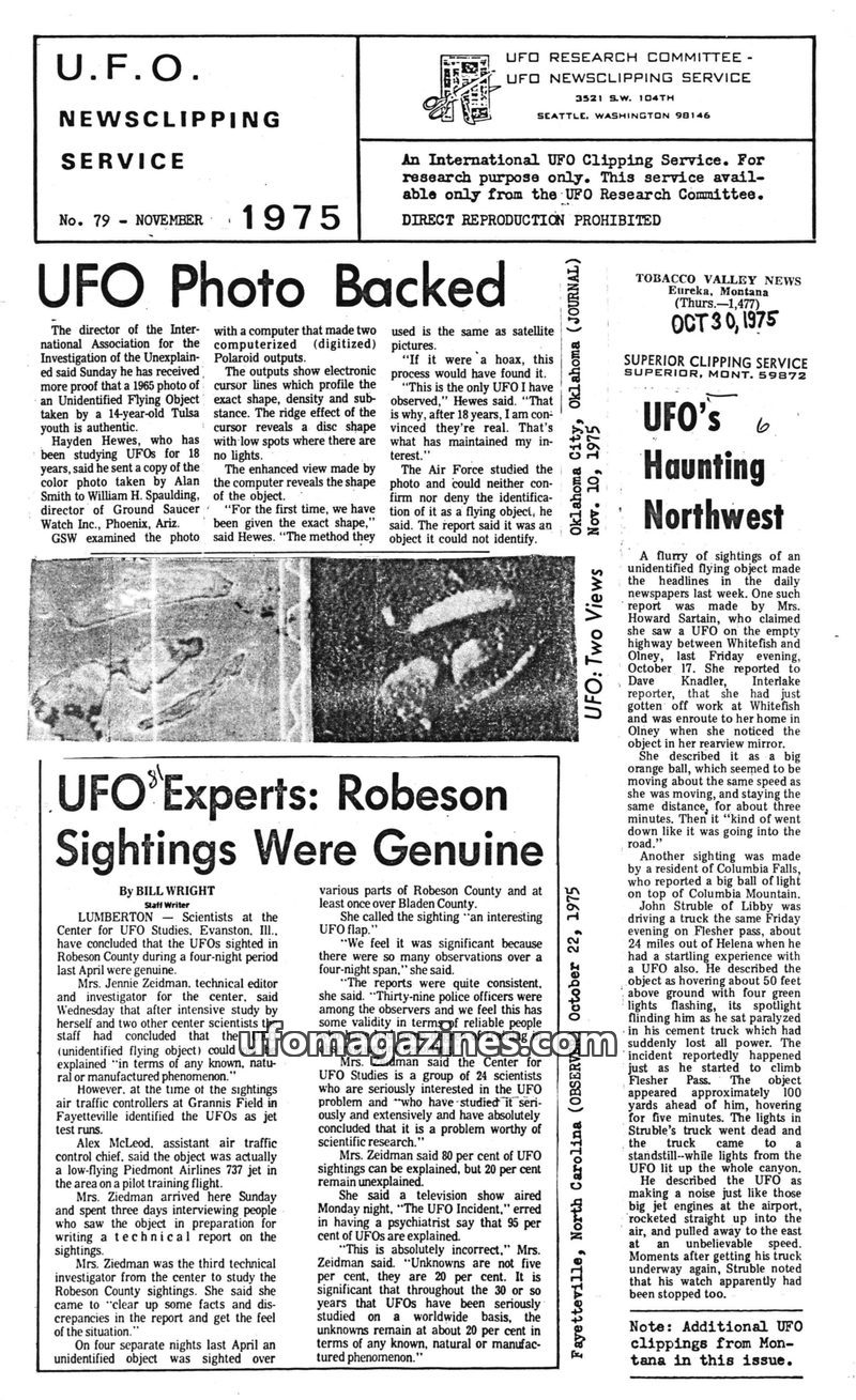 This issue of the UFO Newsclipping Service from November 1975 compiles various reports of unidentified flying objects. It features an analysis of a 1965 UFO photo, expert conclusio