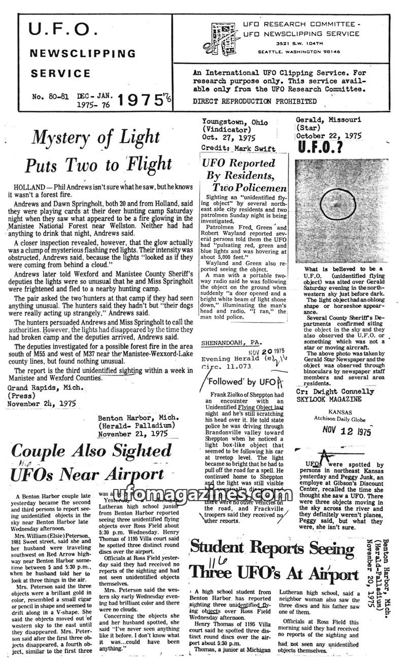 This issue of the UFO Newsclipping Service compiles numerous UFO sightings and related incidents from late 1975. Reports detail sightings of strange lights and objects across vario