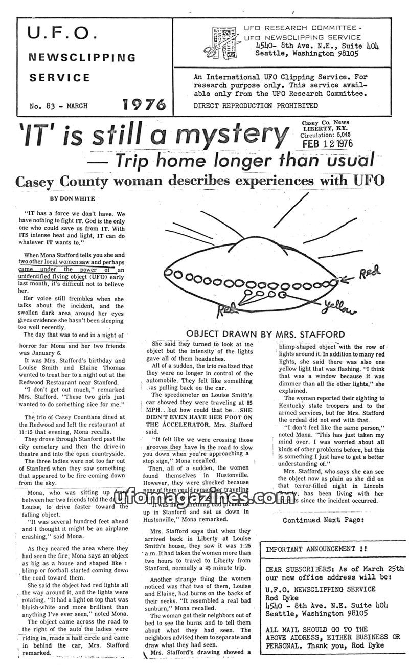 This issue of UFO Newsclipping Service from March 1976 details several compelling UFO sightings and alleged abductions. A key story recounts Mona Stafford's experience on January 6