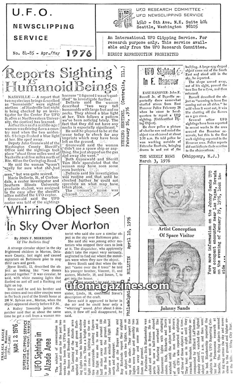 This issue of the UFO Newsclipping Service from April/May 1976 compiles numerous UFO sightings and humanoid encounters from across the United States. Reports include sightings of "