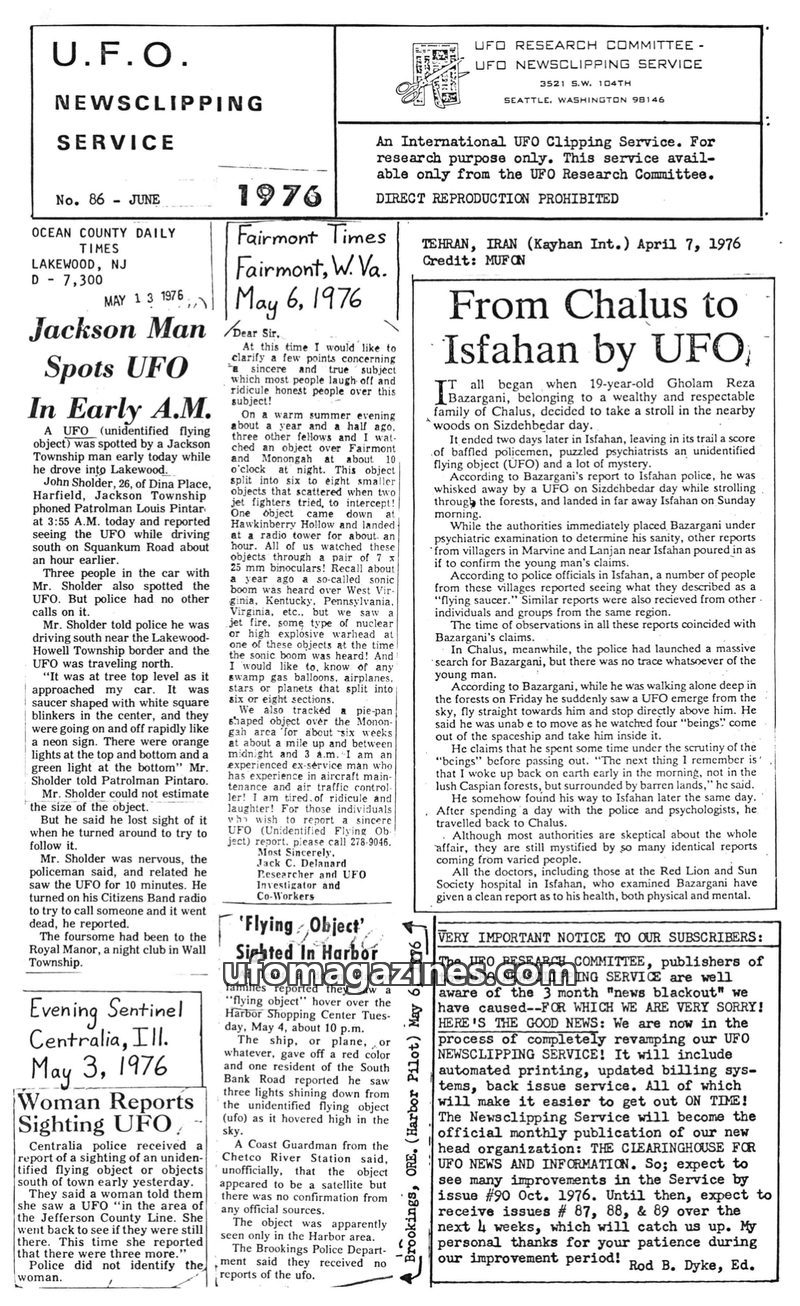 This issue of the UFO Newsclipping Service compiles numerous UFO sighting reports from May and June 1976 across the USA and Iran. Accounts range from detailed descriptions of aeria