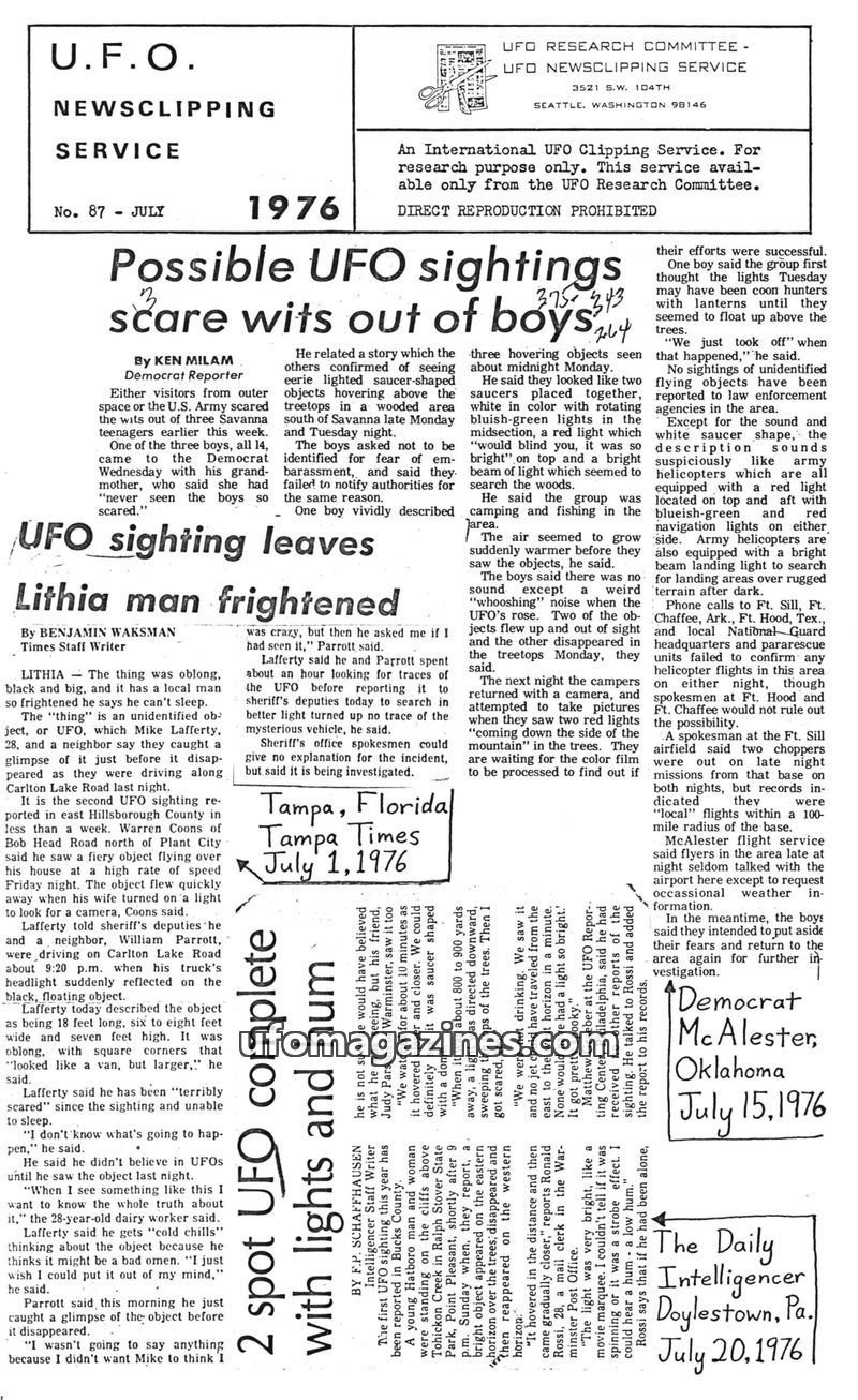 This issue of the UFO Newsclipping Service from July 1976 compiles several UFO sighting reports from across the United States. Articles detail incidents where young boys in Savanna