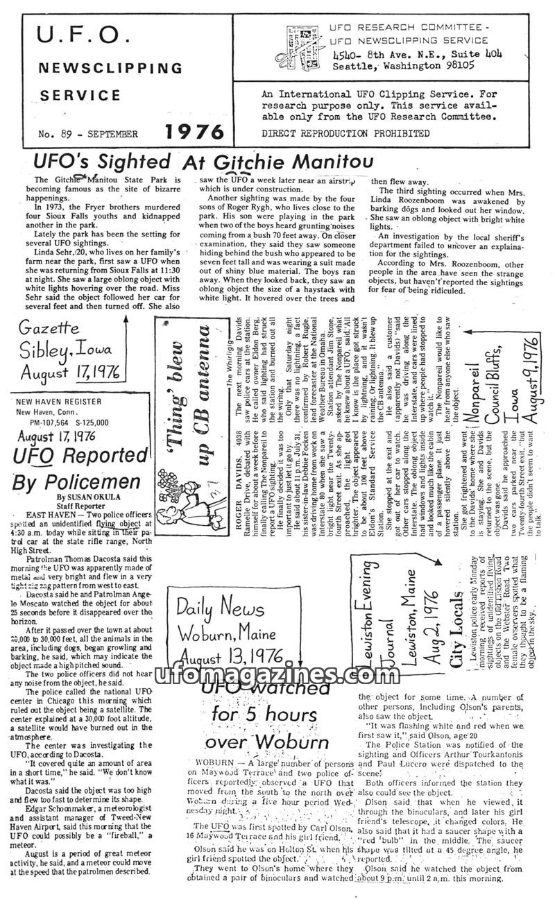 This issue of the UFO Newsletter from September 1976 details numerous UFO sightings across the United States. A prominent report covers sightings at Gitchie Manitou State Park, wit