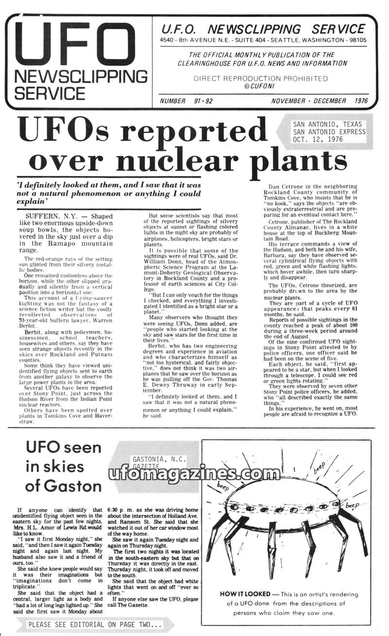 This issue of U.F.O. Newsclipping Service from November-December 1976 covers numerous UFO sightings across the USA, including reports over nuclear plants in New York, mysterious li