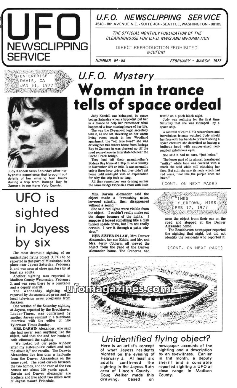 This issue of UFO Newsclipping Service covers various UFO sightings and related phenomena from late 1976 and early 1977. A prominent story details Judy Kendell's account of a possi