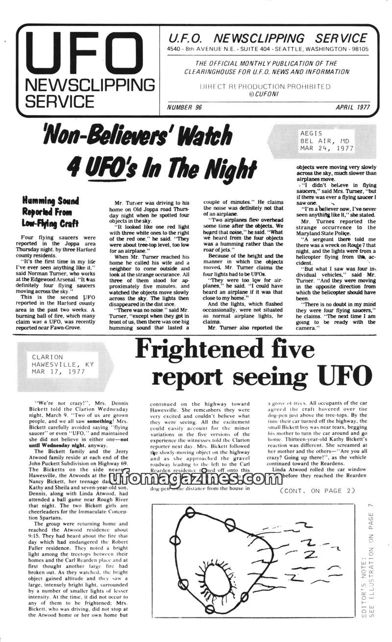 This issue of UFO Newsclipping Service from April 1977 details numerous UFO sightings across the United States. Reports include multiple objects seen in Joppa, Maryland, and a sign