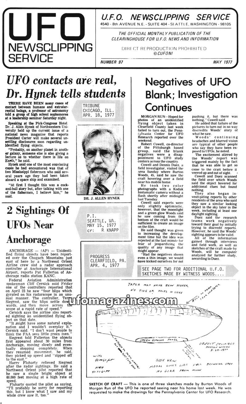This issue of UFO Newsclipping Service from May 1977 covers various UFO sightings and expert opinions. Dr. J. Allen Hynek asserts that UFO contacts are real and discusses his evolv