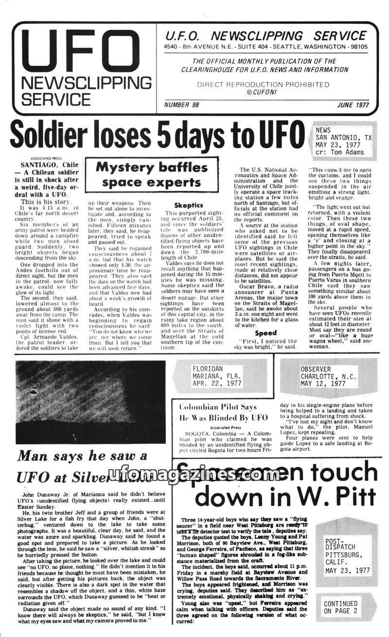This issue of UFO Newsclipping Service from June 1977 details numerous UFO sightings and encounters. A Chilean soldier reportedly lost five days after a UFO encounter, while a Colo