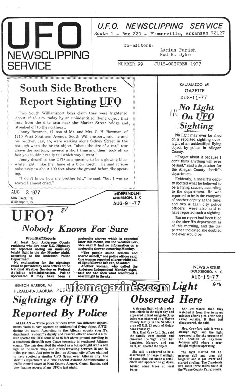 This issue of the UFO Newsclipping Service, dated July-October 1977, compiles numerous reports of unidentified flying objects from across the United States. Sightings range from br