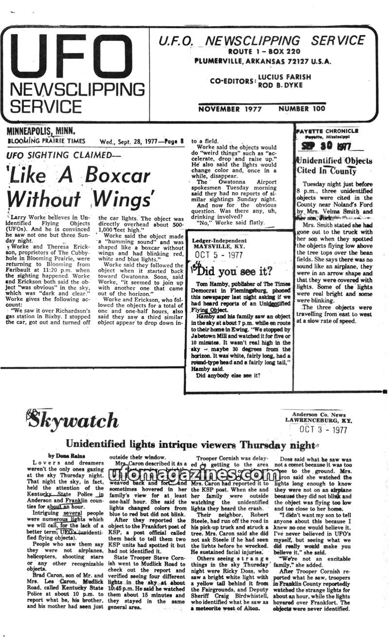 This issue of the UFO Newsclipping Service from November 1977 features several reported UFO sightings from across the United States. Articles detail claims from Minnesota, Kentucky