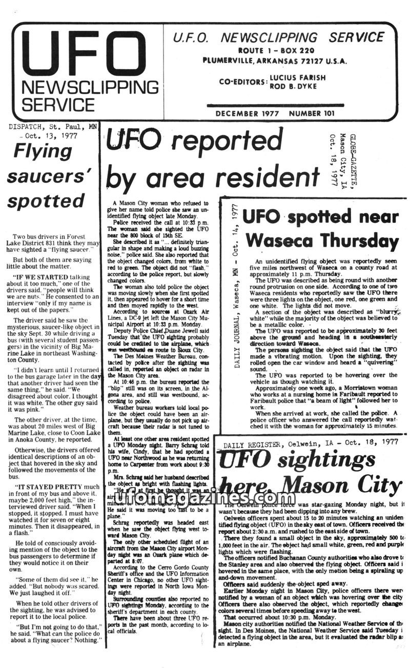 This issue of the UFO Newsclipping Service from December 1977 compiles numerous UFO sighting reports from late 1977 across the United States. Eyewitness accounts detail objects des