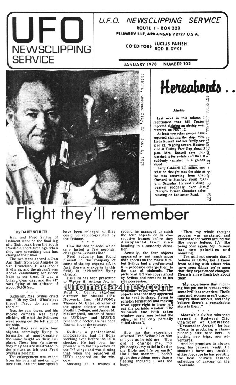 This issue of UFO Newsclipping Service features several compelling UFO sighting reports. Fred Svihus recounts his experience of seeing four objects from a commercial airliner, lead