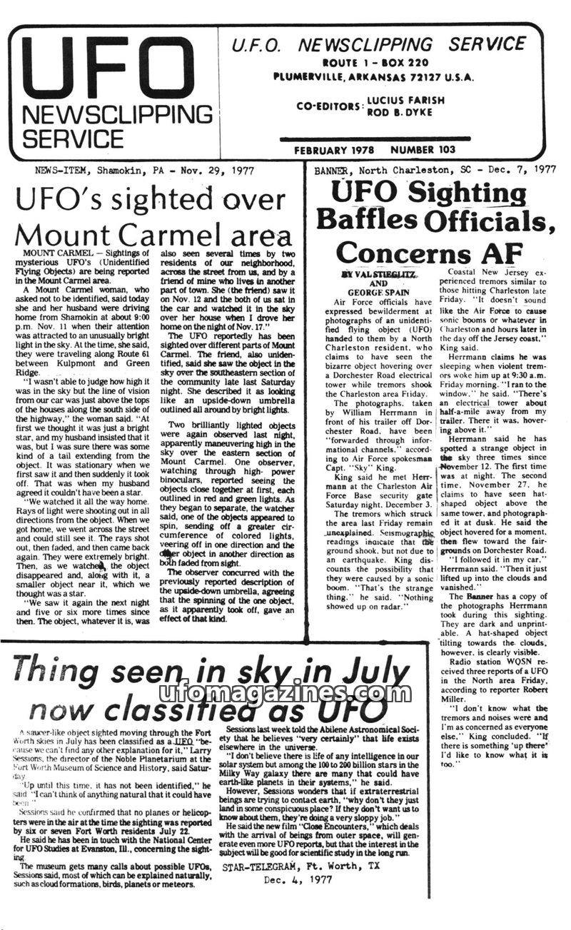 This collection of news clippings from late 1977 and early 1978 details numerous UFO sightings across the United States, including reports from Mount Carmel, PA; North Charleston,