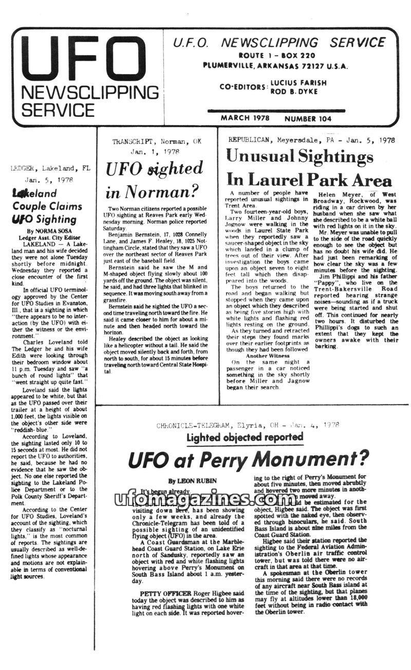 This issue of U.F.O. Newsclipping Service compiles numerous UFO sightings reported in early 1978 from various locations across the United States. Reports detail objects described a