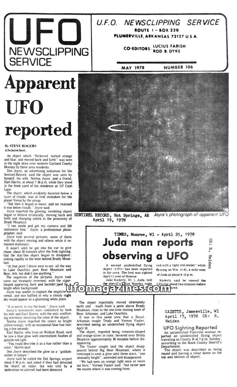 This issue of UFO Newsclipping Service from May 1978 details multiple UFO sightings reported across the United States. A notable report from Arkansas describes a flickering, color-