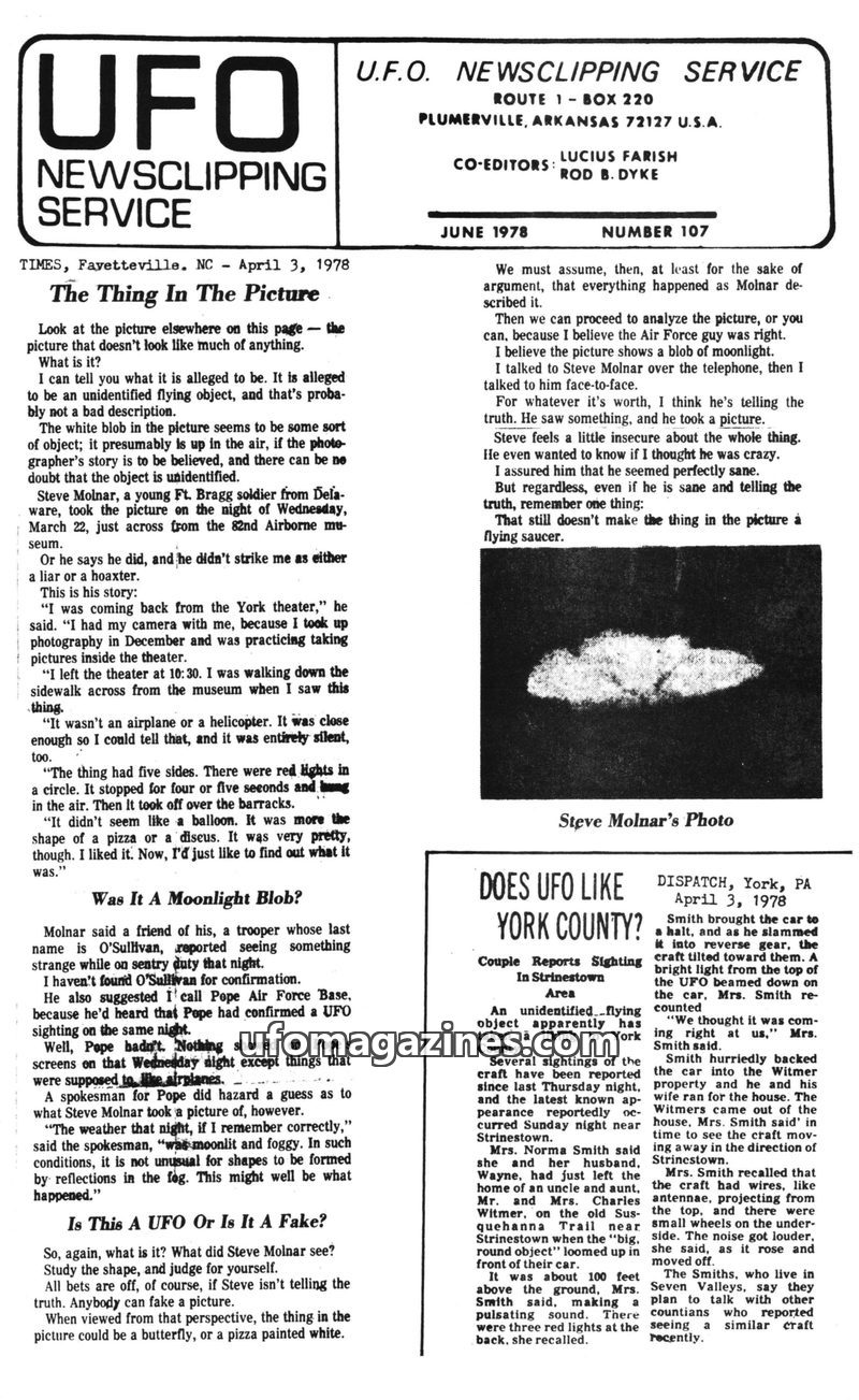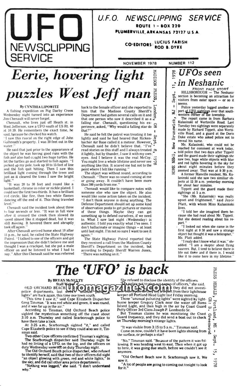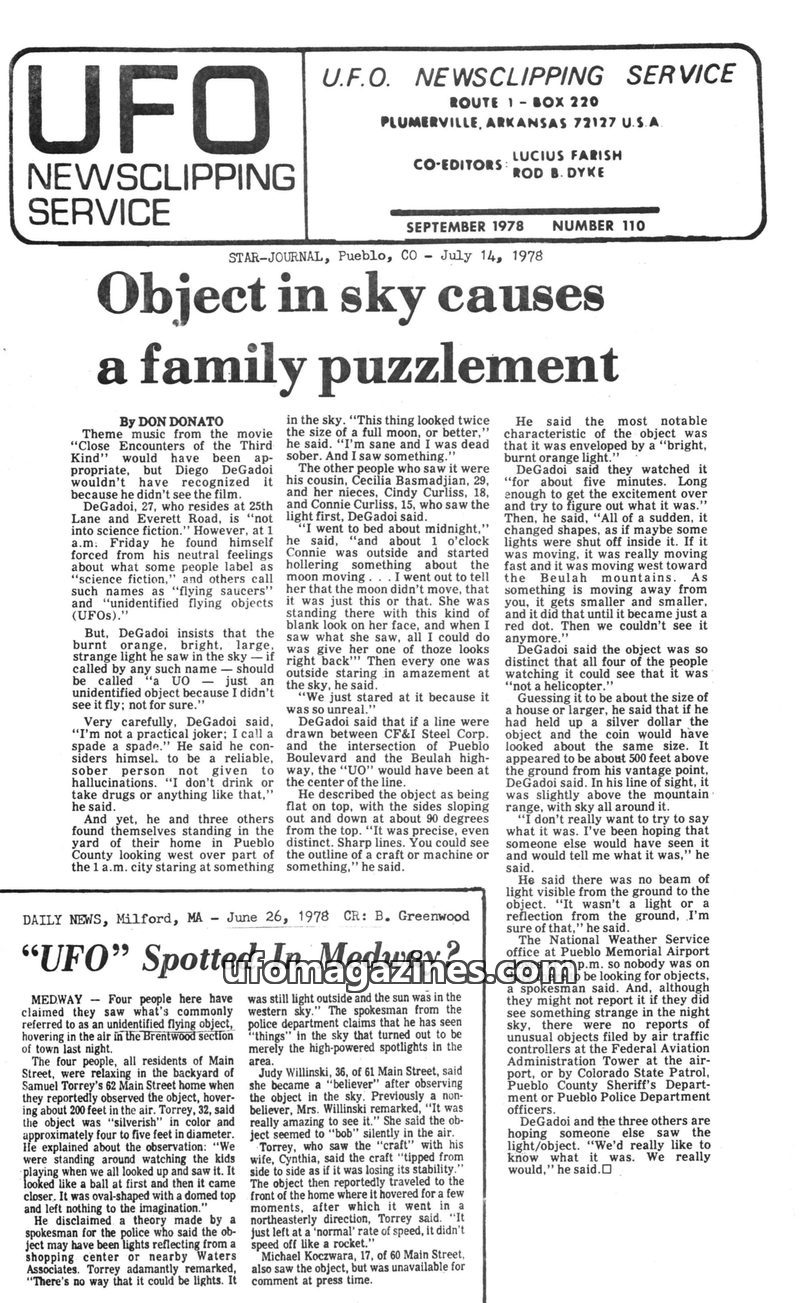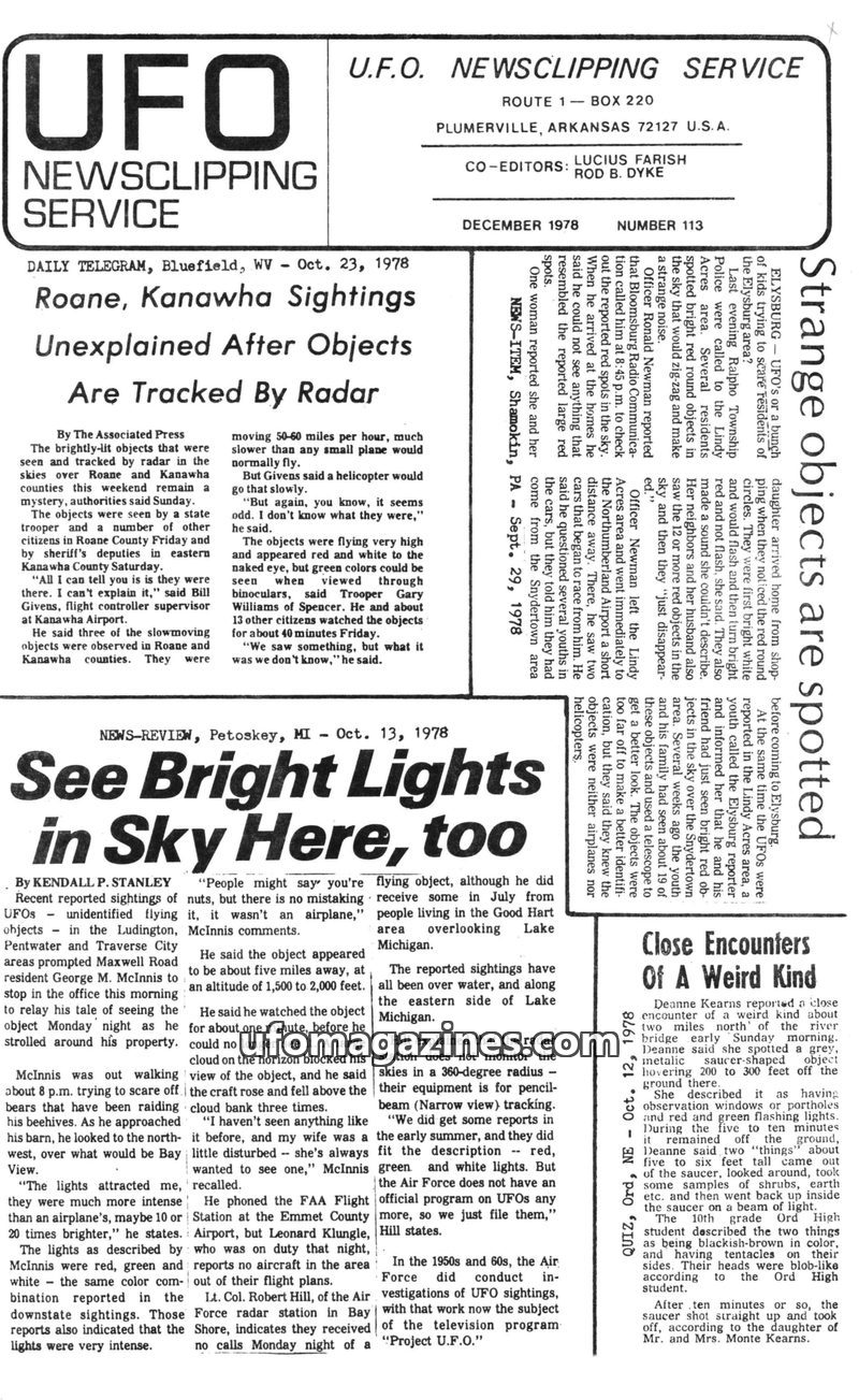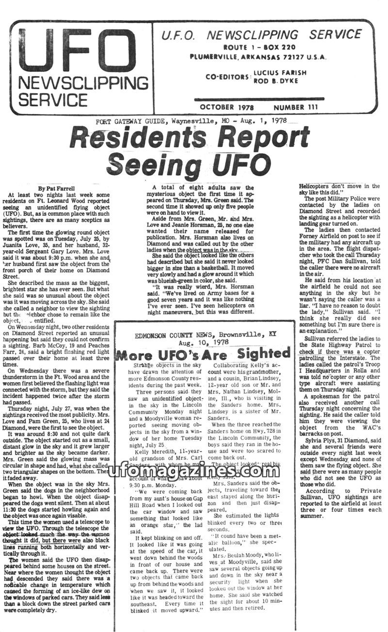 This issue of the UFO Newsclipping Service details numerous UFO sightings across the United States in the summer of 1978. Reports range from glowing objects and strange lights to m