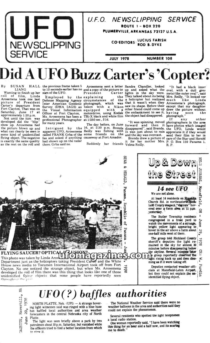 This issue of UFO Newsclipping Service from July 1978 features multiple reports of unidentified flying objects. A key story details a UFO sighting near President Carter's helicopte