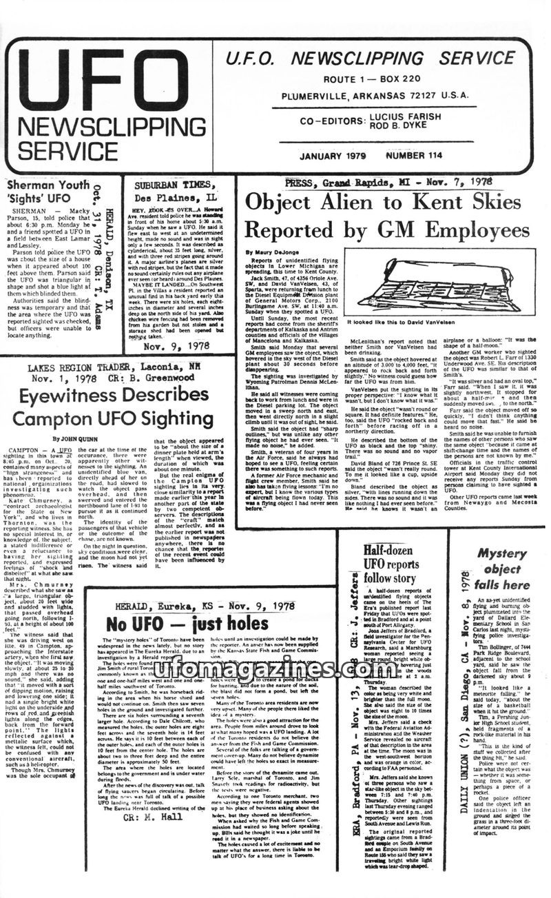 This issue of the UFO Newsclipping Service from January 1979 compiles numerous UFO sighting reports from late 1978. Key incidents include a sighting by General Motors employees in