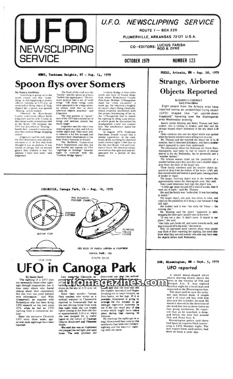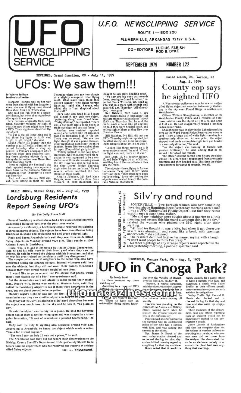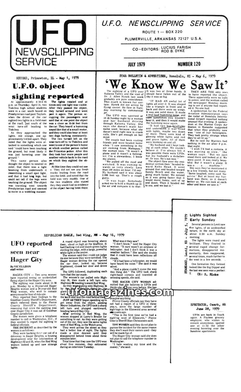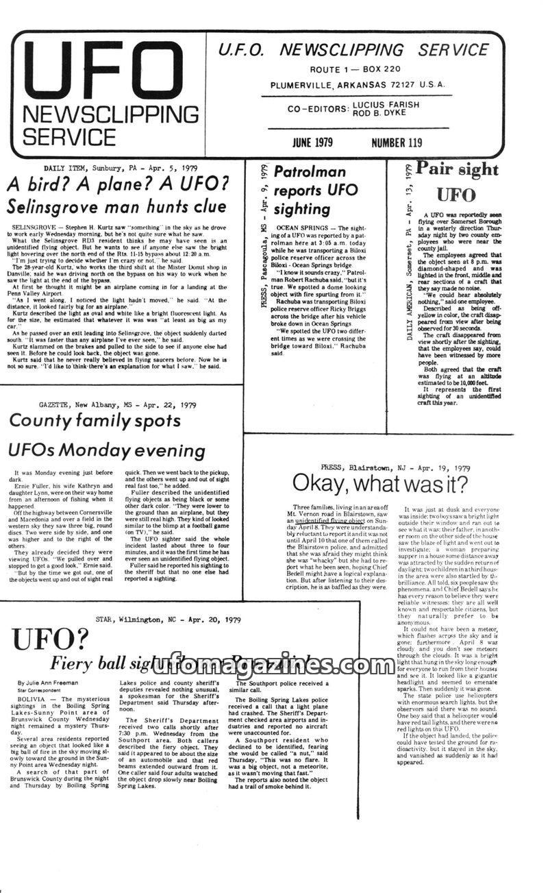 This issue of UFO Newsclipping Service compiles numerous reports of unidentified flying objects from various locations in the USA and UK during June and July 1979. Sightings range