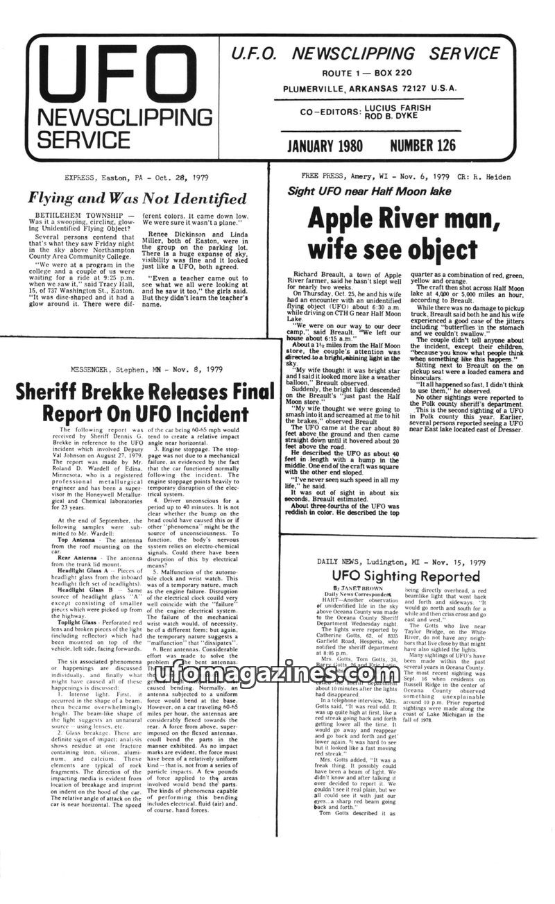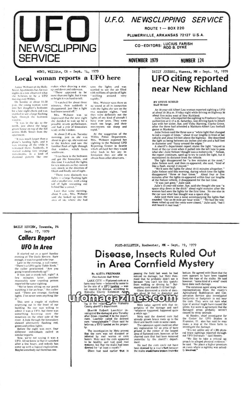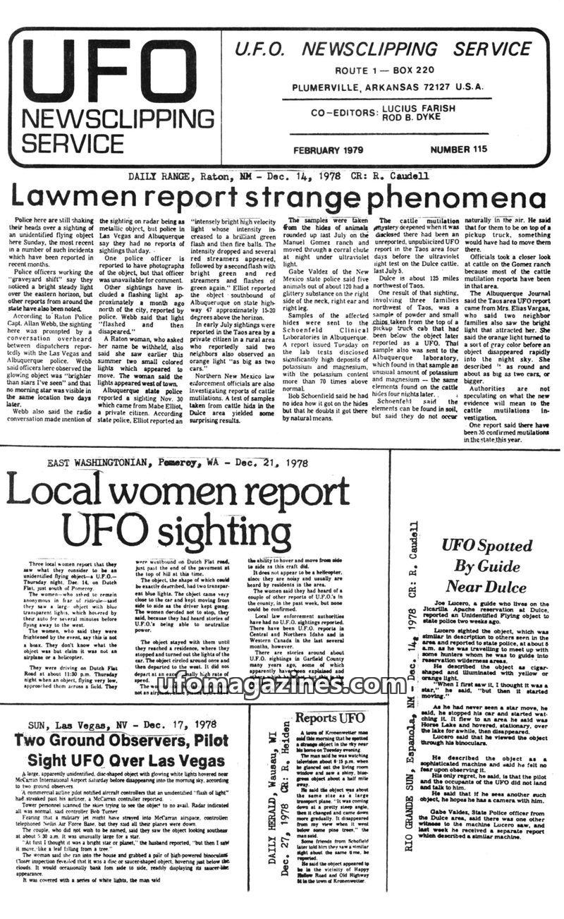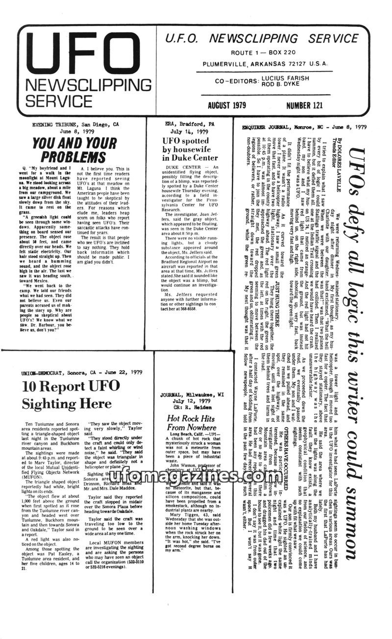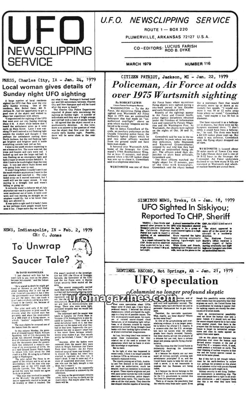 This issue of UFO Newsclipping Service compiles numerous reports of unidentified flying objects from various locations in the USA and UK during June and July 1979. Sightings range