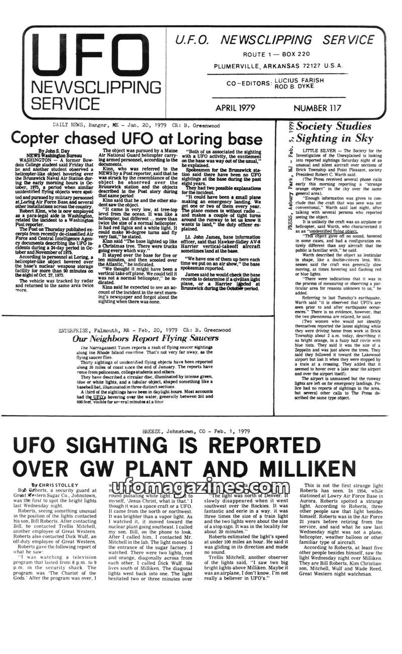 This issue of the UFO Newsclipping Service from April 1979 compiles numerous reports of unidentified flying objects from across the United States. Articles detail sightings ranging