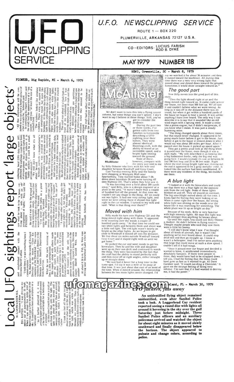 This issue of UFO Newsclipping Service from May 1979 focuses on numerous local UFO sightings across the USA and UK. Articles detail reports from Oconee County, SC, Davison, MI, and