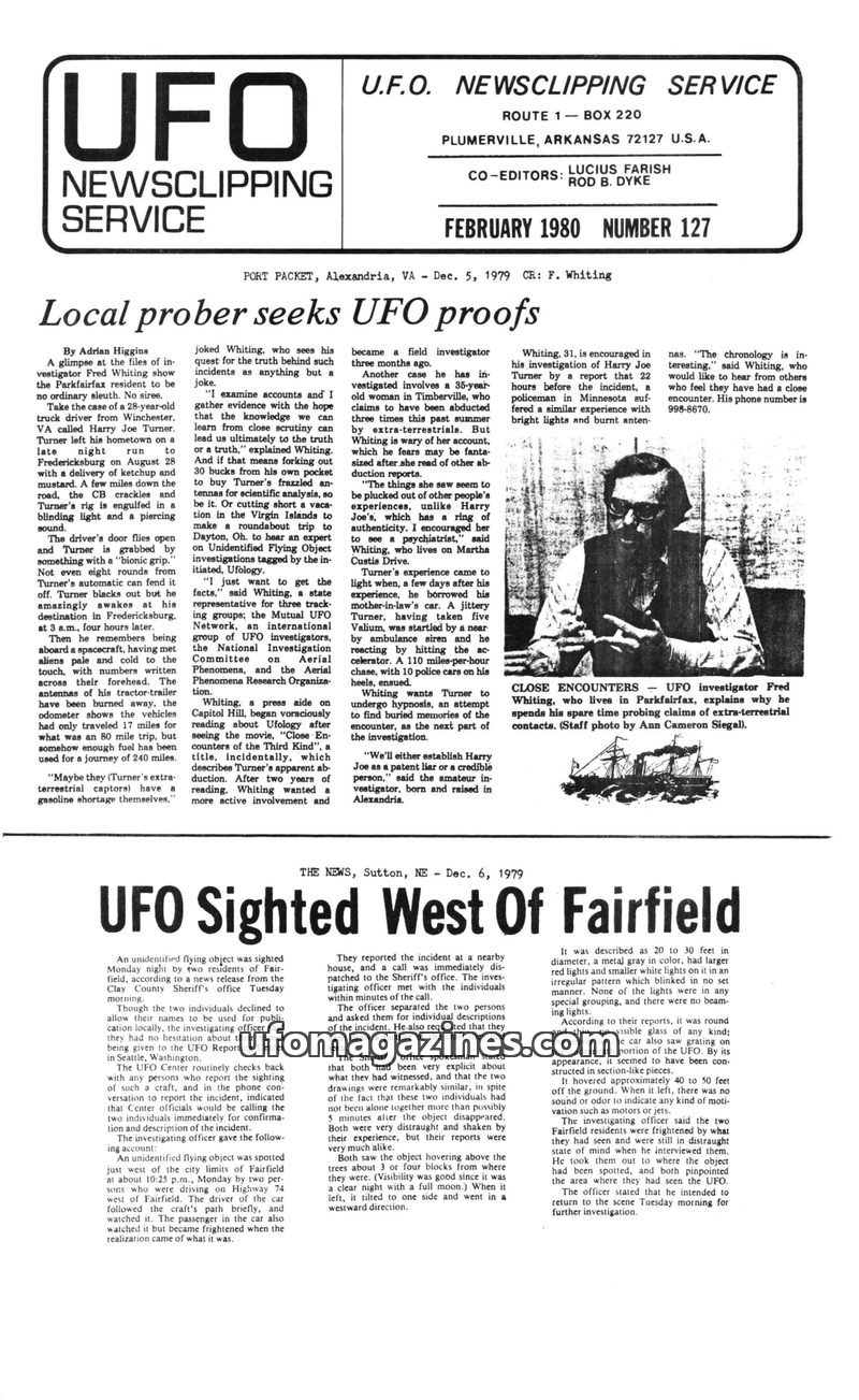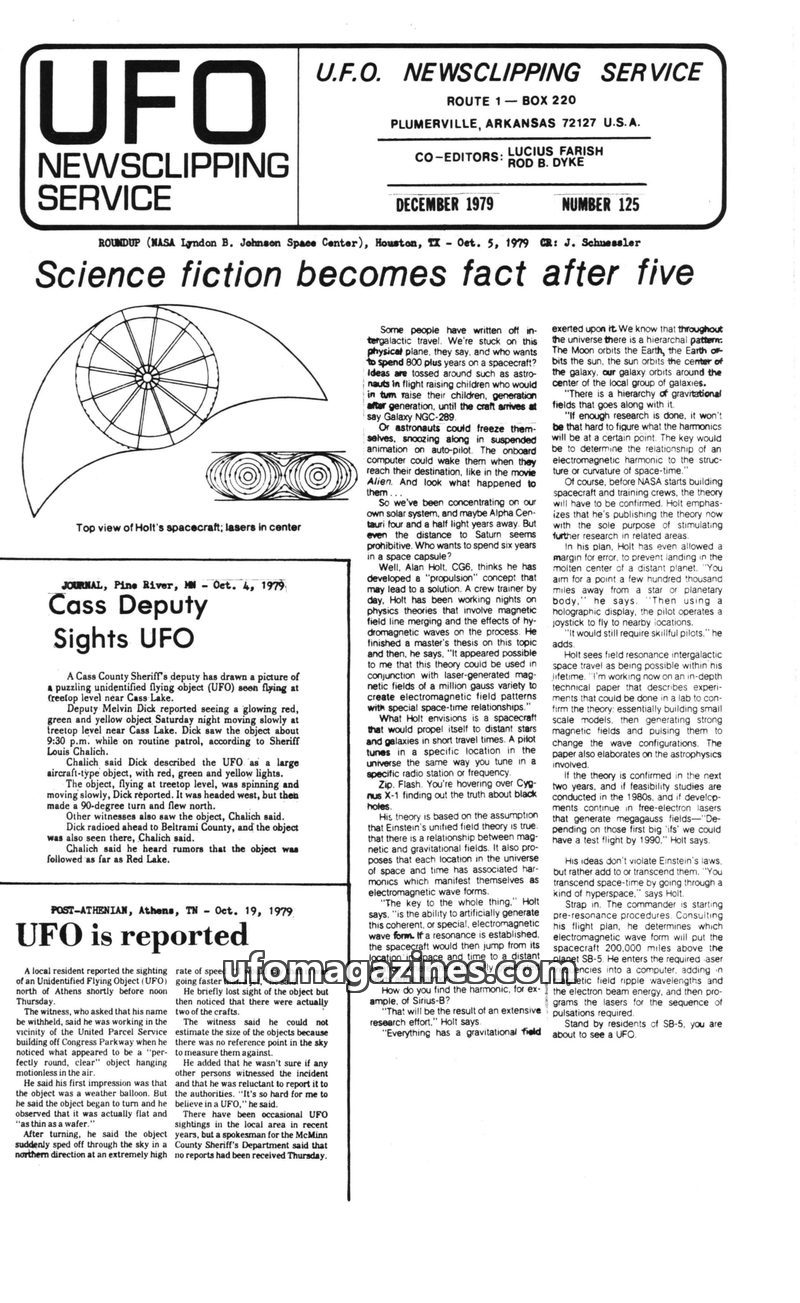 This issue of UFO News Clipping Service from December 1979 explores the blurring line between science fiction and reality regarding UFOs. It features multiple witness accounts of s