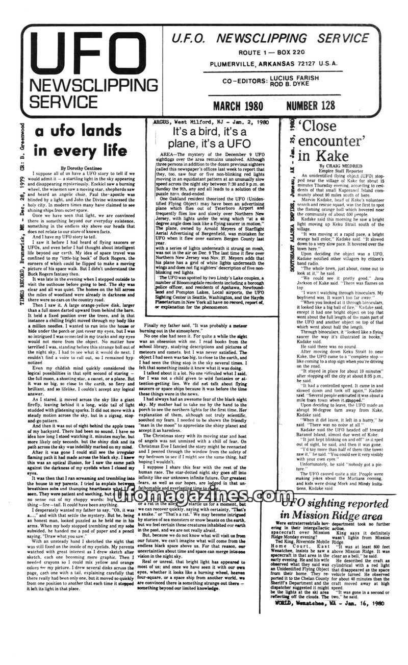 This issue of UFO Newsclipping Service features multiple reports of unidentified flying objects and strange lights across the United States. A man in West Jefferson, USA, reported