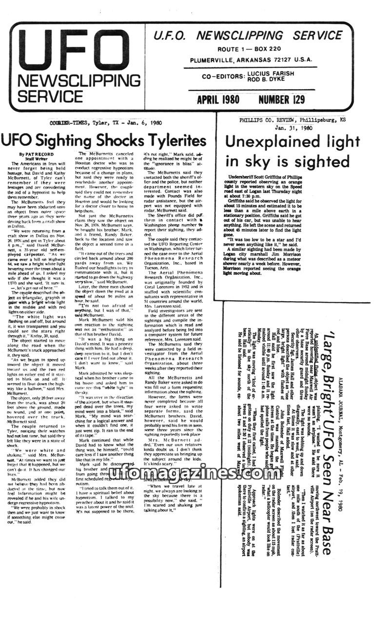 This issue of UFO Newsclipping Service from April 1980 features multiple reports of unidentified flying objects. The lead story details the McBurnett family's experience of a possi