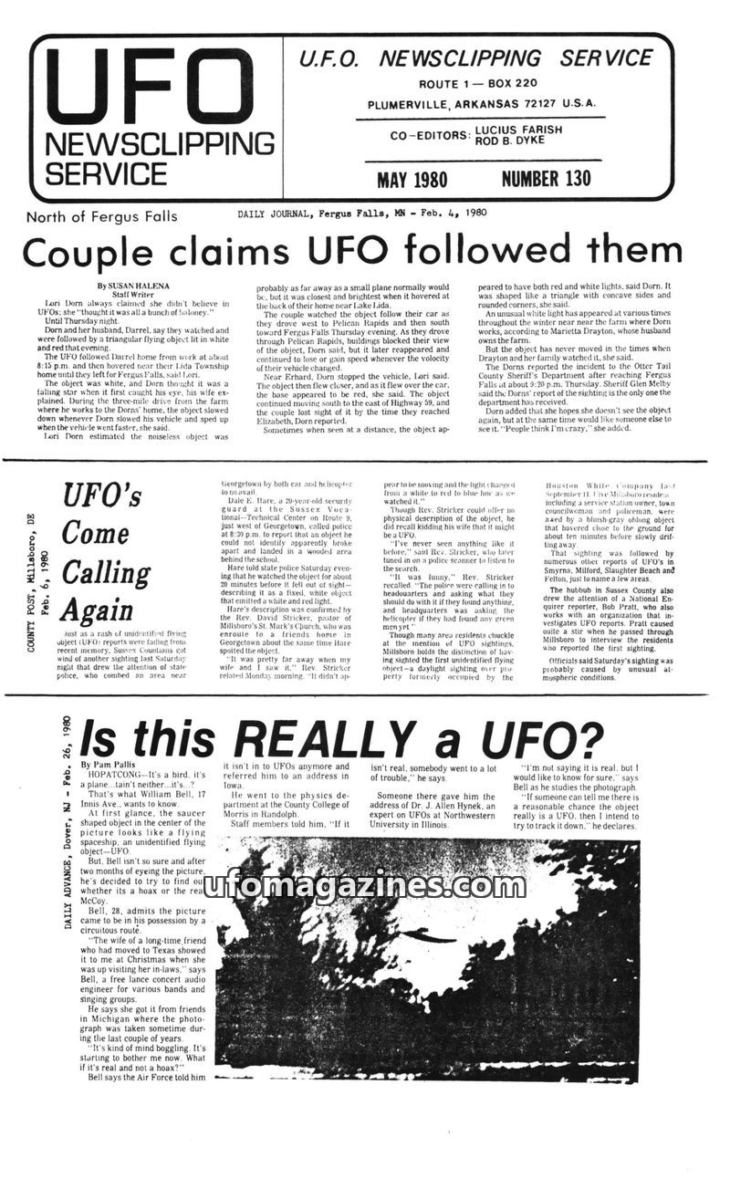 This issue of the UFO Newsclipping Service from May 1980 compiles numerous UFO sightings from February to April 1980 across the United States. Reports detail objects described as t