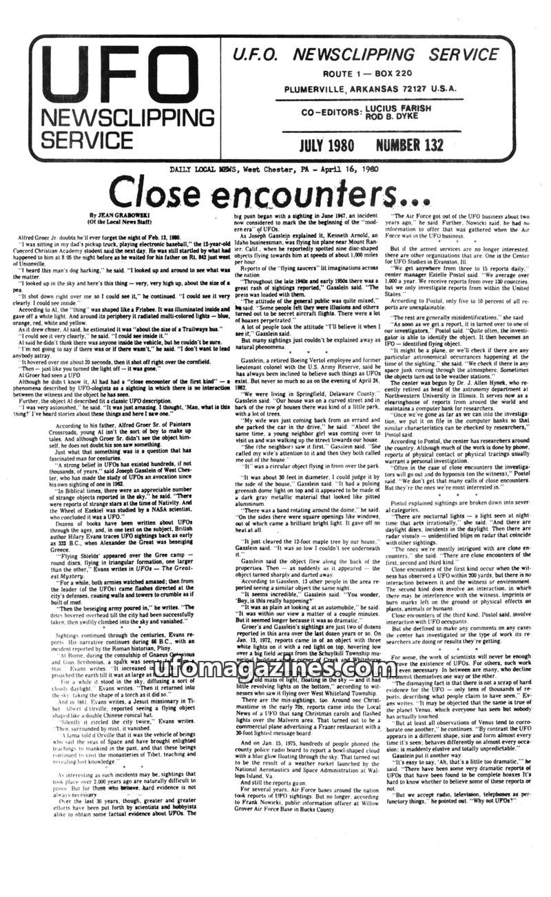 This issue of the UFO Newsclipping Service details numerous UFO sightings and encounters from various locations, including Pennsylvania, Louisiana, and Argentina. It highlights wit