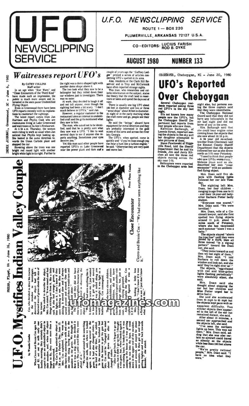 This issue of UFO Newsclipping Service from August 1980 compiles various UFO sightings from across the United States and Australia. Reports include a Cheboygan, Michigan sighting o