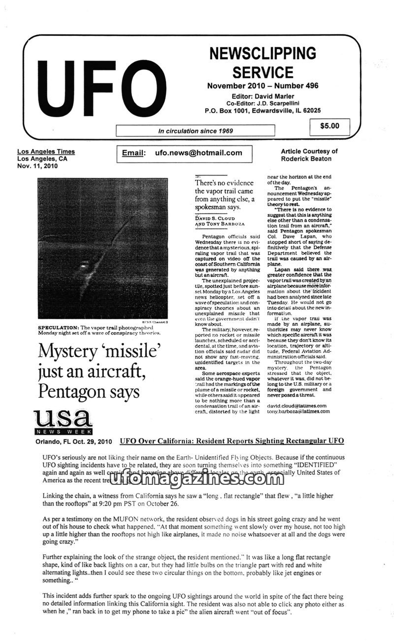 This issue of UFO Newsclipping Service covers multiple UFO sightings reported in late 2010. A prominent story details the Pentagon's explanation of a mysterious vapor trail off the
