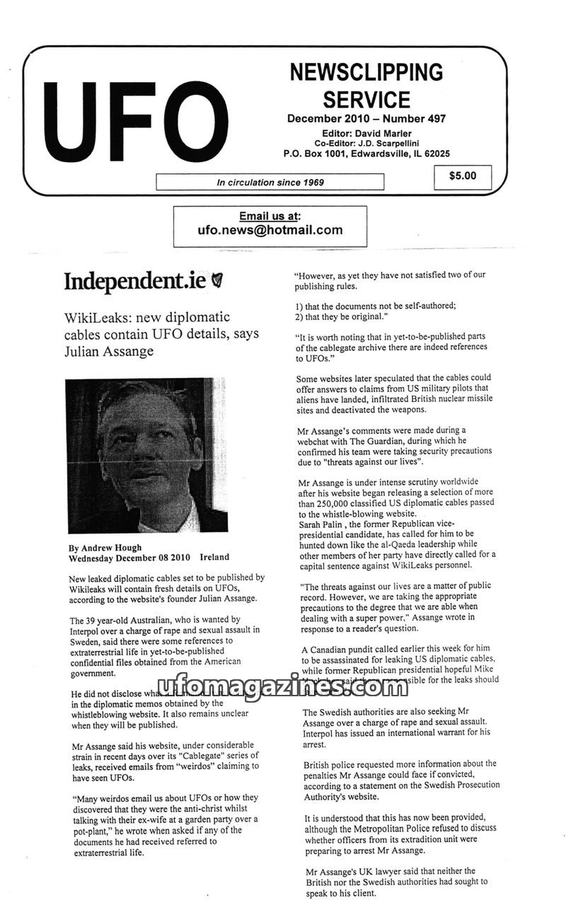 This issue of UFO magazine from December 2010 features a cover story on Julian Assange and WikiLeaks, claiming diplomatic cables contain UFO details. It also compiles numerous UFO