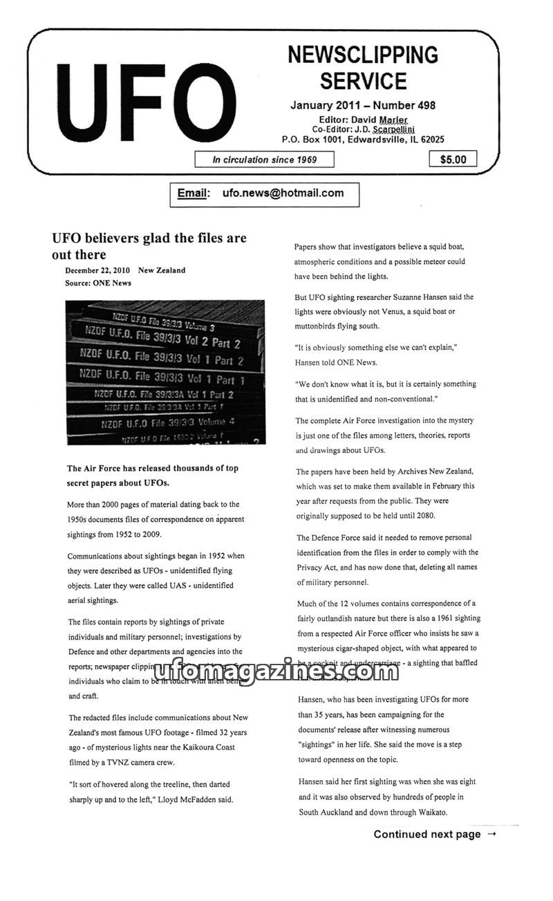 This issue of UFO Newsclipping Service covers the release of thousands of top-secret New Zealand Defence Force files on UFO sightings dating back to the 1950s. It includes details