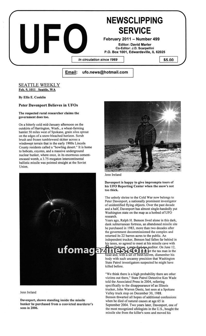 This issue of UFO Newsclipping Service focuses on Peter Davenport, director of the National UFO Reporting Center, who operates from a former missile bunker in Harrington, Washingto