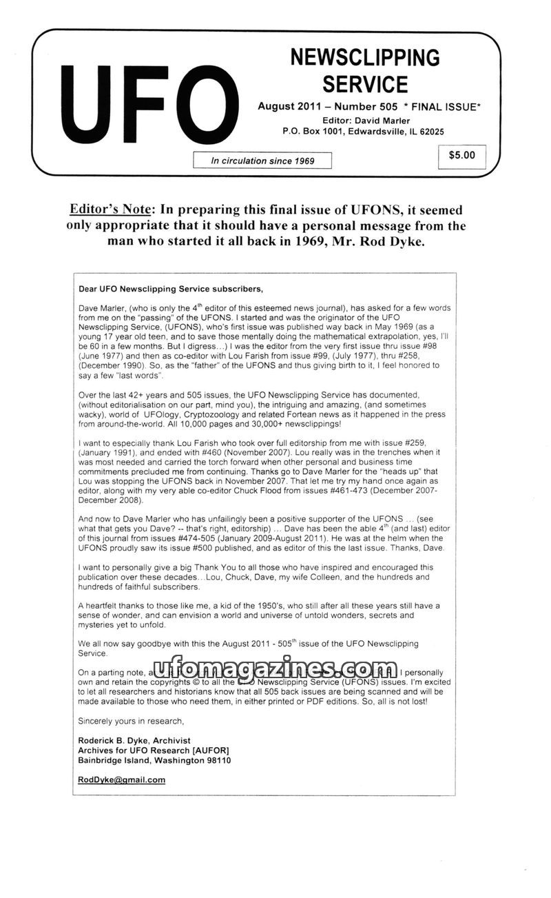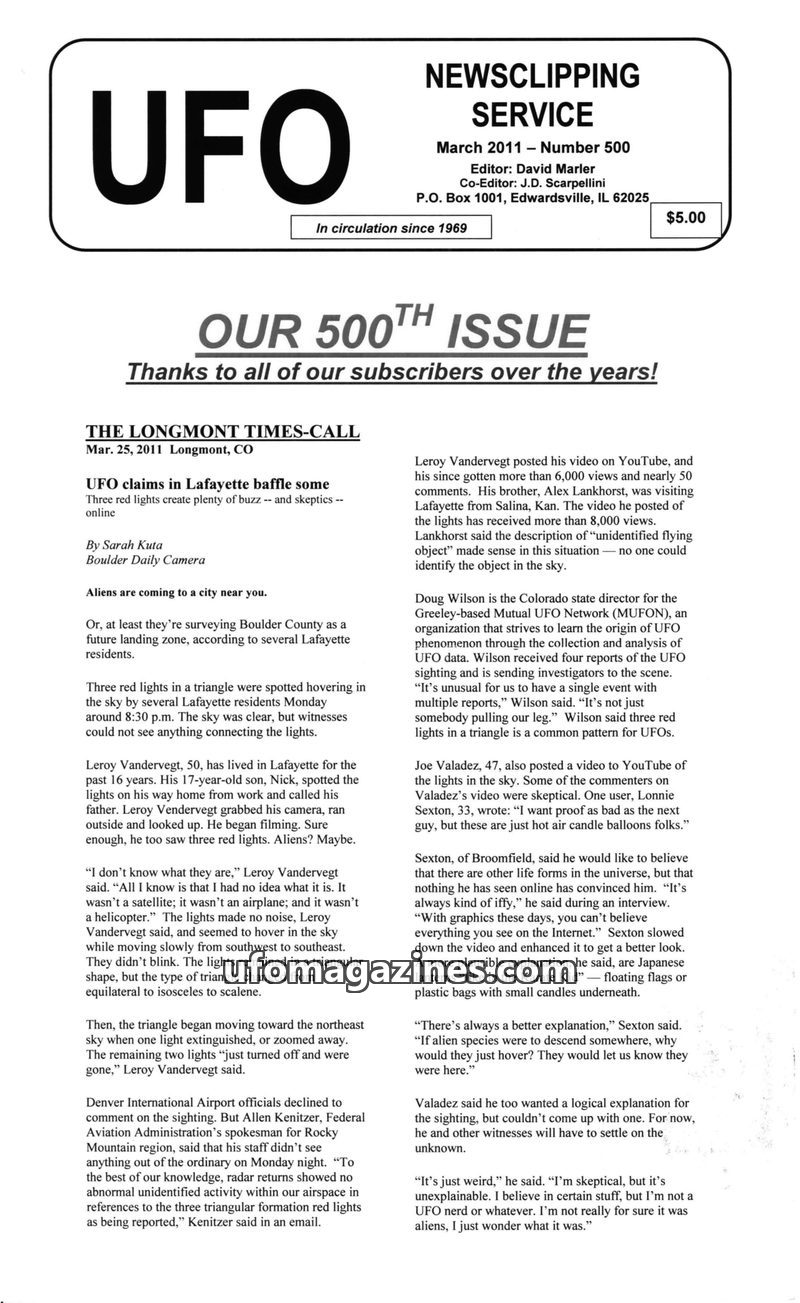 This issue of UFO Newsclipping Service celebrates its 500th edition with a collection of recent and historical UFO reports. Articles detail sightings in Lafayette, Colorado, and Sp