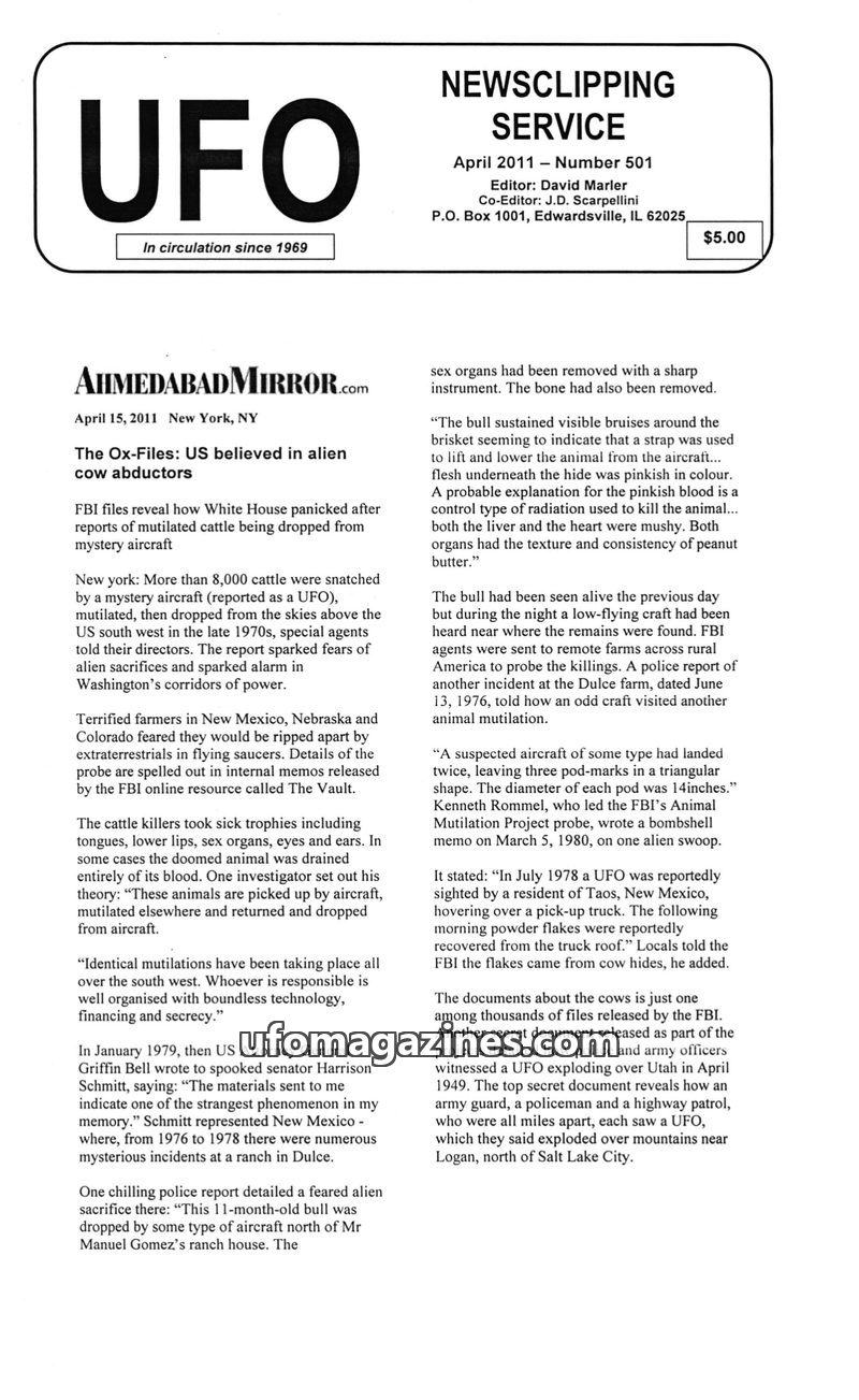 This issue of UFO magazine from April 2011 delves into various UFO phenomena. It highlights FBI files suggesting alien cow abductors and government panic in the late 1970s. The mag