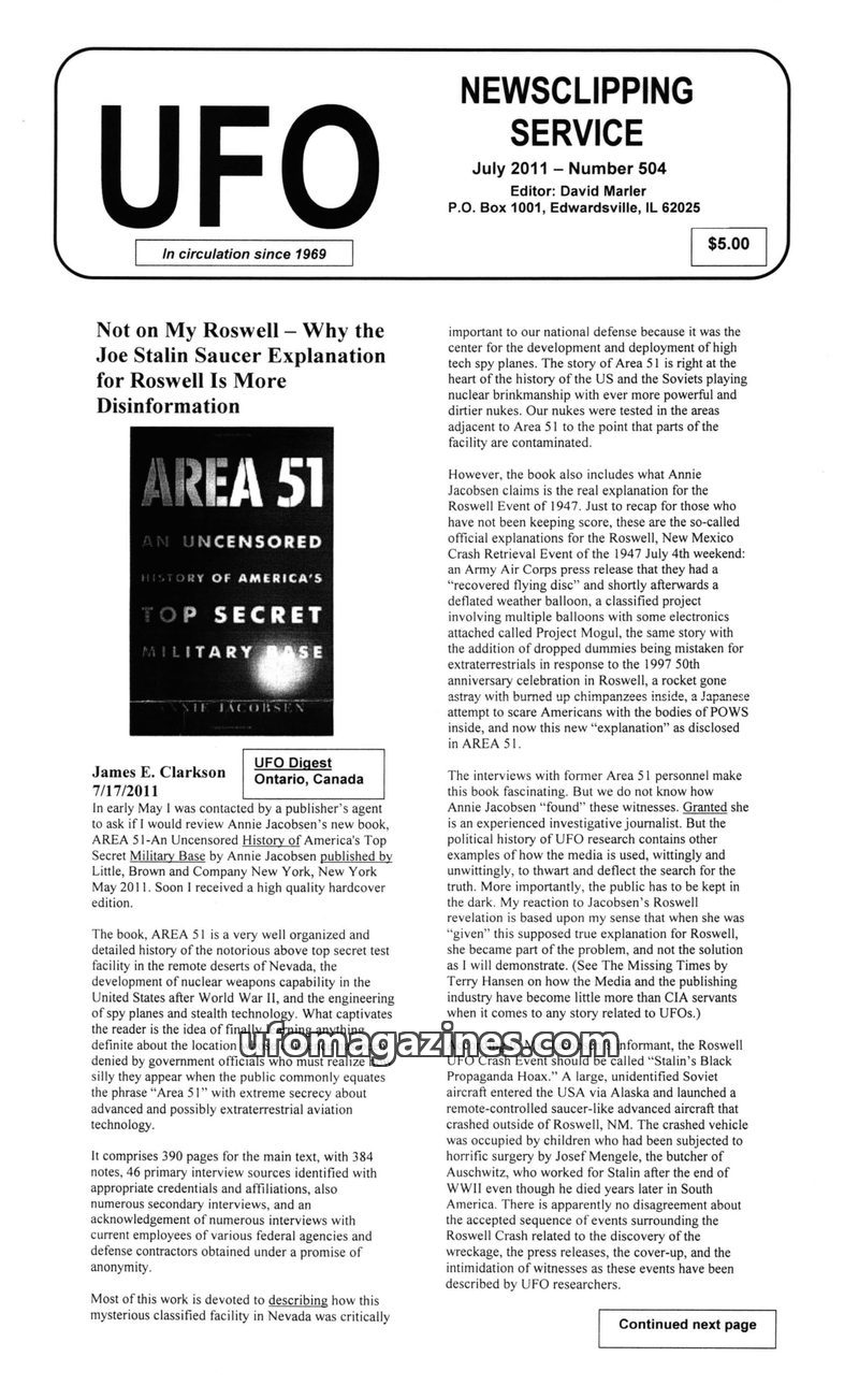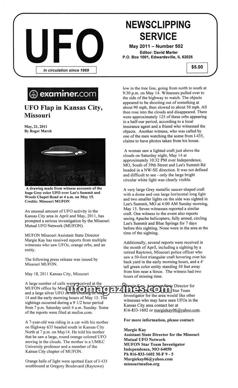 This issue compiles reports on UFO activity, including a flap in Kansas City in April-May 2011, investigations into Area 51's history and potential espionage, and new details emerg