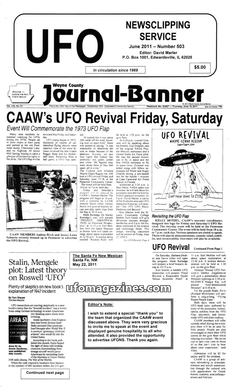 This issue covers the upcoming CAAW UFO Revival event commemorating the 1973 UFO flap in Piedmont, Missouri. It delves into the controversial new book 'Area 51' by Annie Jacobsen,