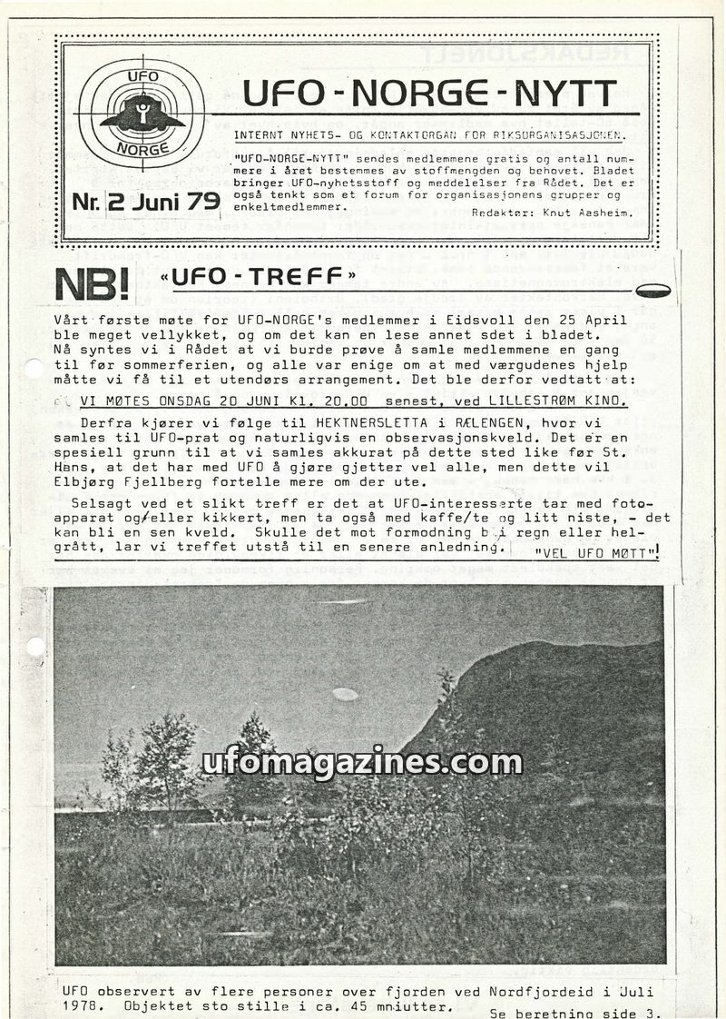 This issue of UFO-Norge-Nytt from June 1979 covers the organization's first successful meeting and plans for future events. It details a UFO sighting in Nordfjordeid in July 1978,