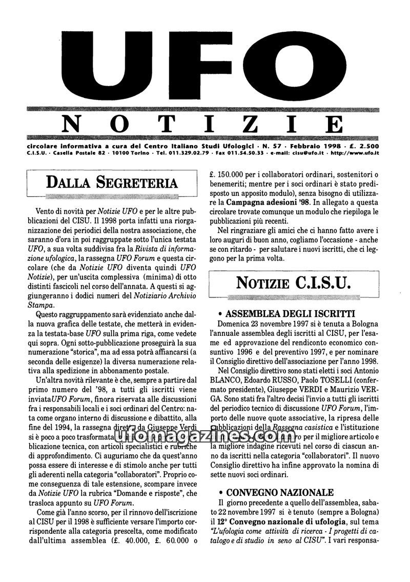 This issue of UFO Notizie, dated February 1998, announces a reorganization of CISU publications under the single masthead 'UFO', with 'UFO Forum' now being sent to all members. It