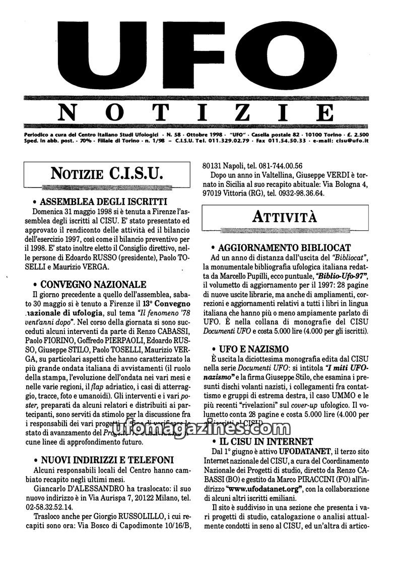 This issue of UFO Notizie (October 1998) details the activities of the Centro Italiano Studi Ufologici (CISU), including their national convention and assembly in Florence. It repo