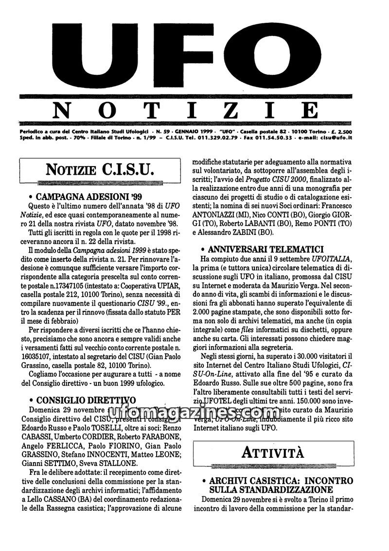 This issue of UFO NOTIZIE, dated January 1999, covers various UFO-related news and activities. It includes updates on the CISU's membership campaign and board meeting, and highligh