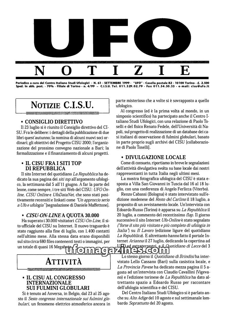 This issue of UFO Notizie from June 1999 covers a range of ufological activities and reports. It details the material received by CISU in the first half of 1999, the annual assembl