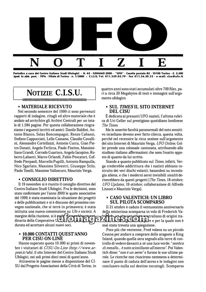 This issue of UFO Notizie from January 2000 covers a wide range of UFO-related activities and reports. It details the material received by CISU in the second half of 1999, the acti