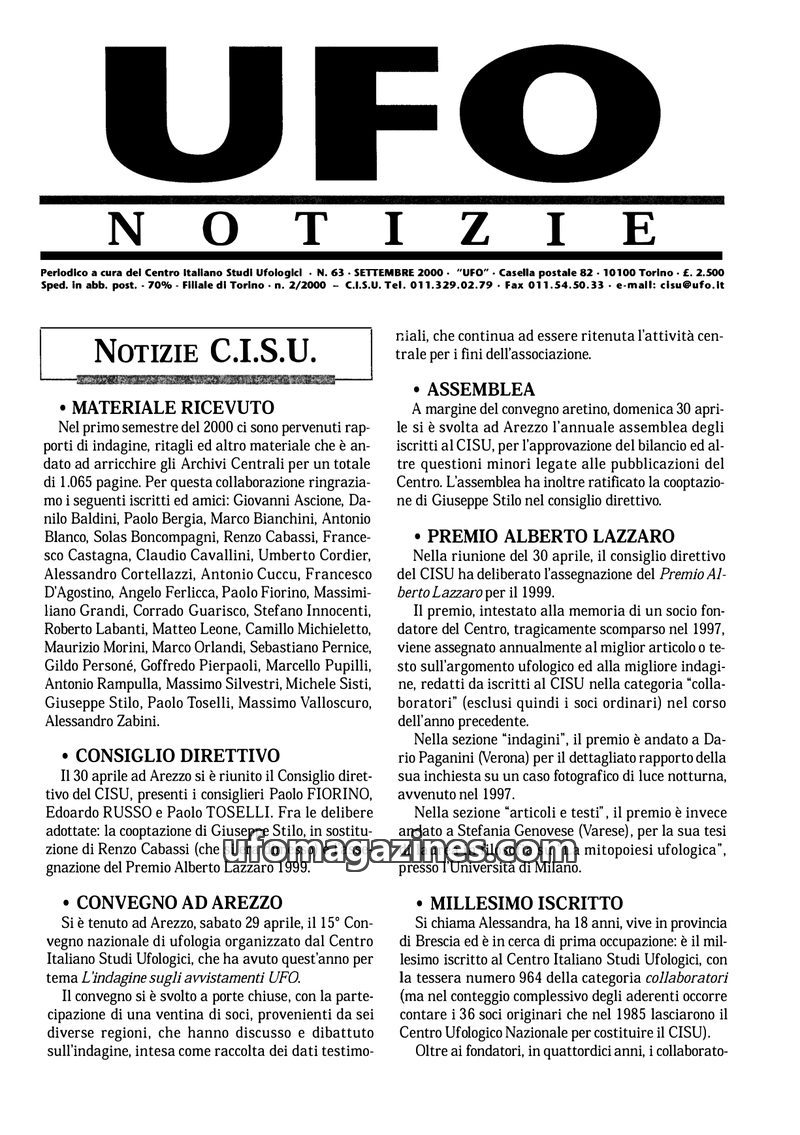 This issue of UFO Notizie from September 2000 covers the activities of the Centro Italiano Studi Ufologici (CISU) in the first half of the year, including their 15th national ufolo
