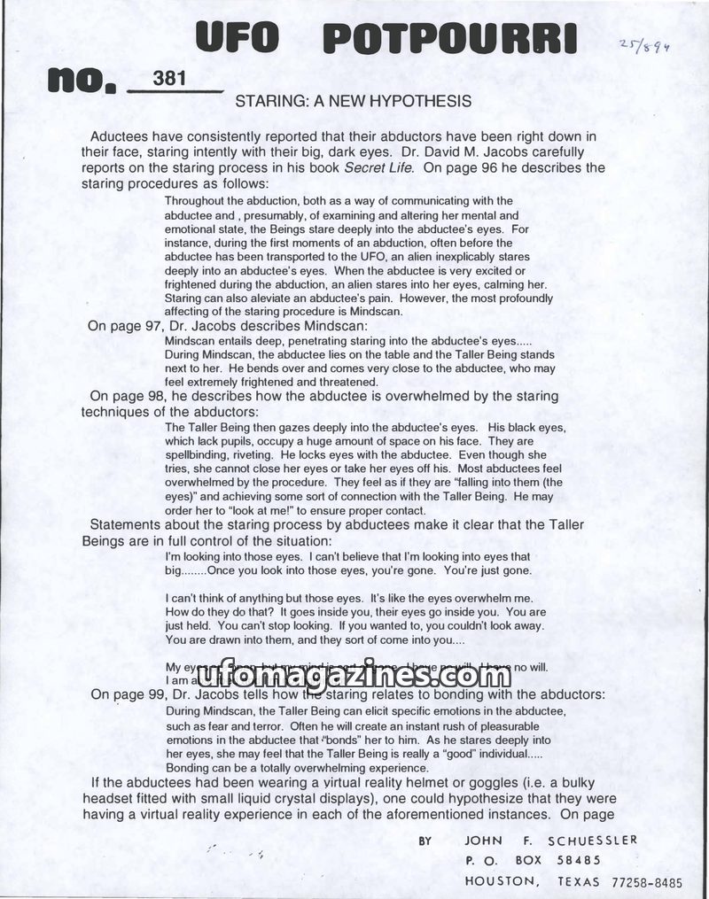 This issue of UFO POTPOURRI, dated 25/894, focuses on the 'staring' phenomenon reported by abductees, as detailed in Dr. David M. Jacobs' book 'Secret Life'. The article describes